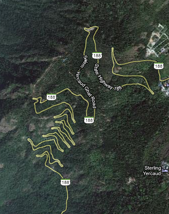 after reaching an elevation of 800 meters above sea level or so, and after having gone around a lot of blind corners, the hairpin curves began. it turns out, according to google maps, that the road to yercaud looks like this: